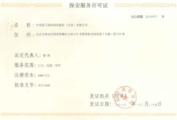 中保國衛(wèi)國際保安服務(wù)(北京)有限公司,屬中保國衛(wèi)集團旗下子公司。能全方位的為大型客戶提供優(yōu)質(zhì)的安保、押運服務(wù),是集人防和技防于一體的新型正規(guī)化綜合安保押運服務(wù)企業(yè),提供人防、物防、技防、聯(lián)網(wǎng)報*、非武裝押運等安防相關(guān)的一站式服務(wù)。